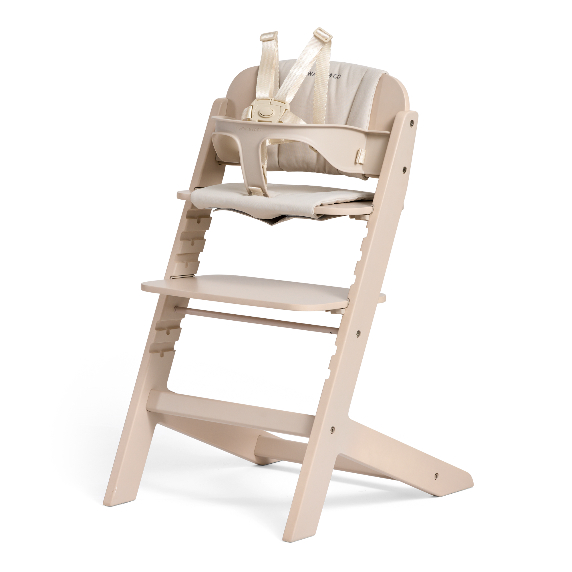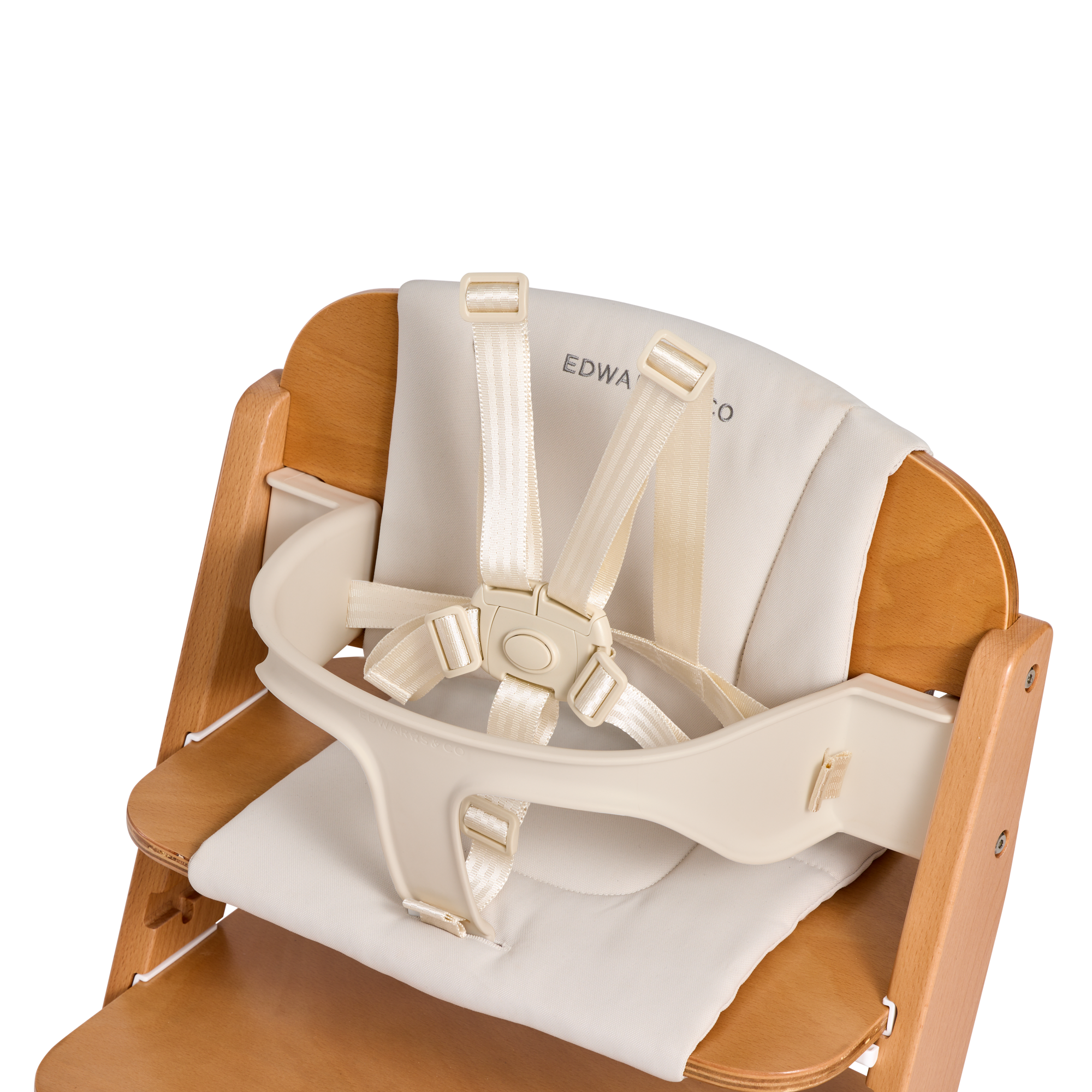 The mess-resistant fabric is a lifesaver: wipe clean after meals or toss it in the washing machine for a deeper refresh. Crafted from solid beech wood, it's sturdy, durable, and timeless. A 5- point harness keeps little ones secure (and removes easily when they're ready for more independence), while non-slip silicone dots under the seat fabric keep everything in place.