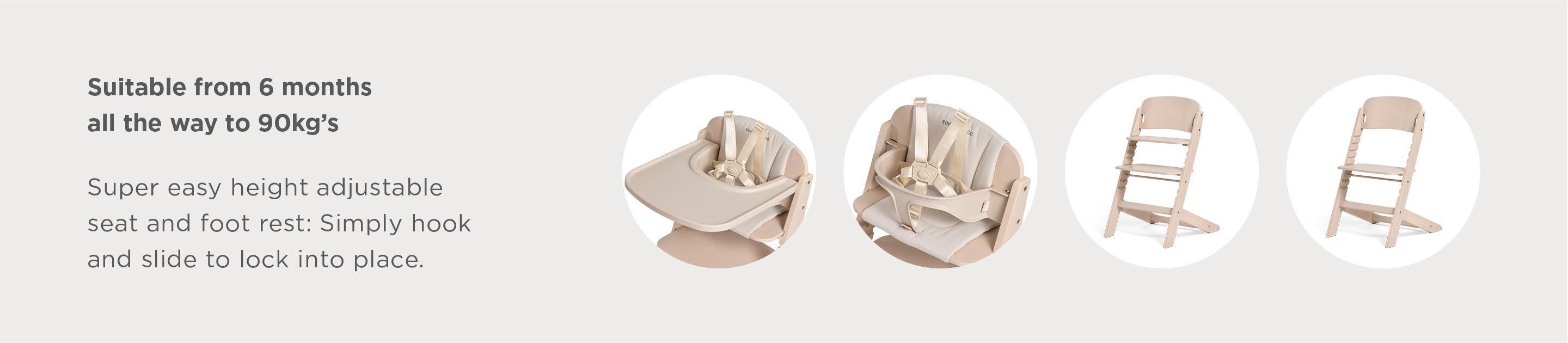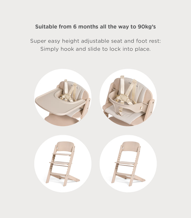 From first tastes at 6 months to full-grown family dinners, this highchair is built to grow with your child-all the way up to 90kg. Thoughtfully designed for both function and style, it features a super simple seat and footrest adjustment system just hook, slide, and lock into place as they grow.