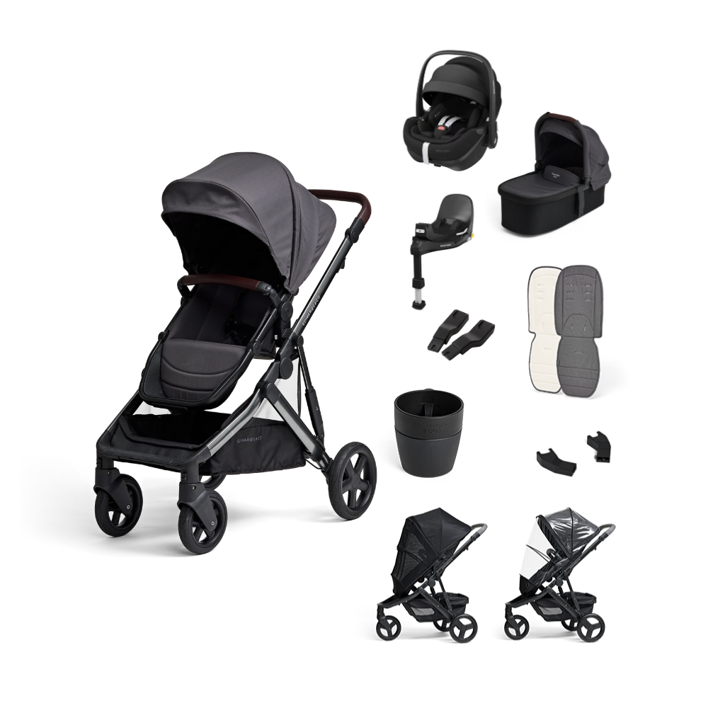 Olive Stroller, Carry Cot 2, Maxi-Cosi Pebble 360 Pro Capsule with adapters, Maxi-Cosi 360 SlideTech Base, Sun Cover, Rain Cover, Luxe Liner, Cup Holder & Lower Adaptors for the Olive (great if you are using the Olive in double mode)